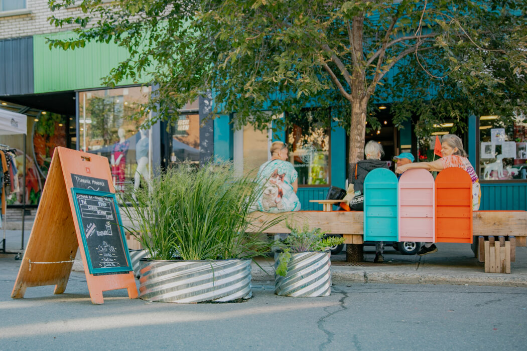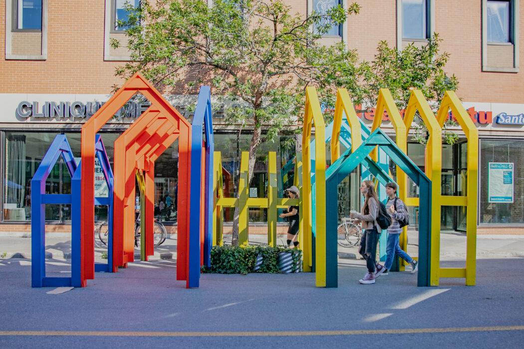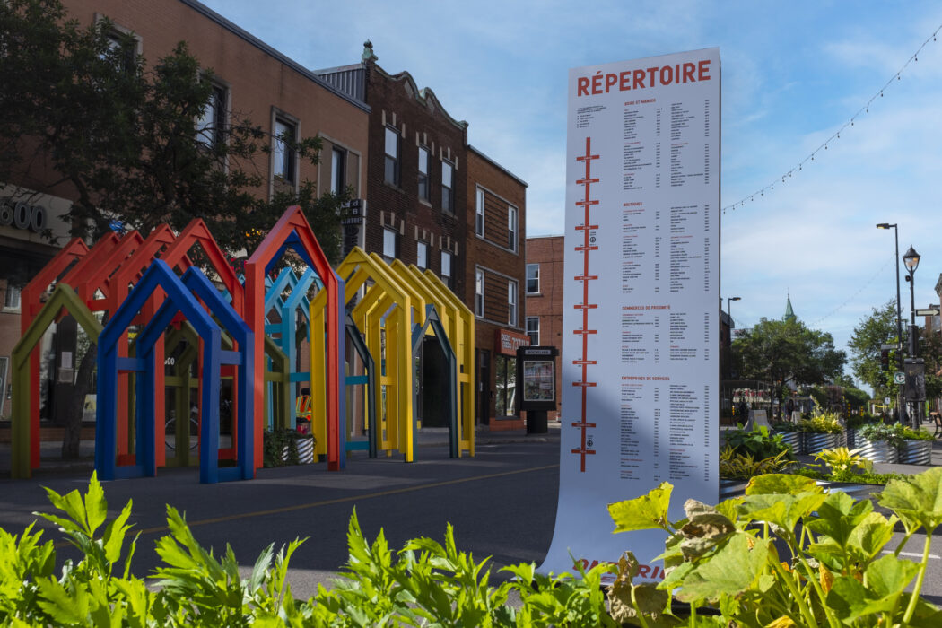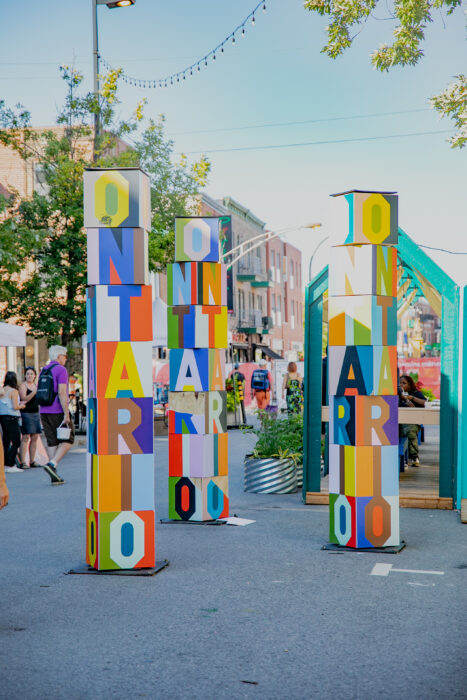 La Ville de Montréal réitère pour une troisième édition cette initiative de piétonnisation dans les grandes artères commerciales, celle-là même qui lui a permis de s’illustrer au palmarès des rues les plus cool du monde selon Time Out. Intitulée Ontario en couleur, la promenade Ontario se pare de couleurs bigarrées, celles empruntées aux commerces de quartier qui personnifient la diversité de Montréal. À cette palette en courtepointe s’allie une typographie inspirée du lettrage d’enseigne. Identifiant le parcours, des amoncellements de blocs évoquent des caractères de bois et interpellent le passant dans sa douce déambulation, un parcours ponctué d’aires de repos. Un geste graphique qui se déploie sur une multitude de déclinaisons dont des oriflammes, le marquage au sol, des totems grandeur nature et des palissades d’affichages.