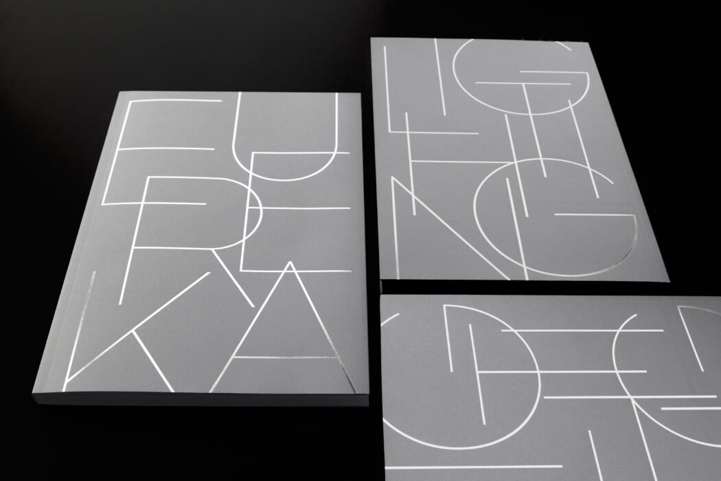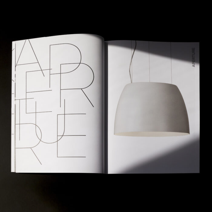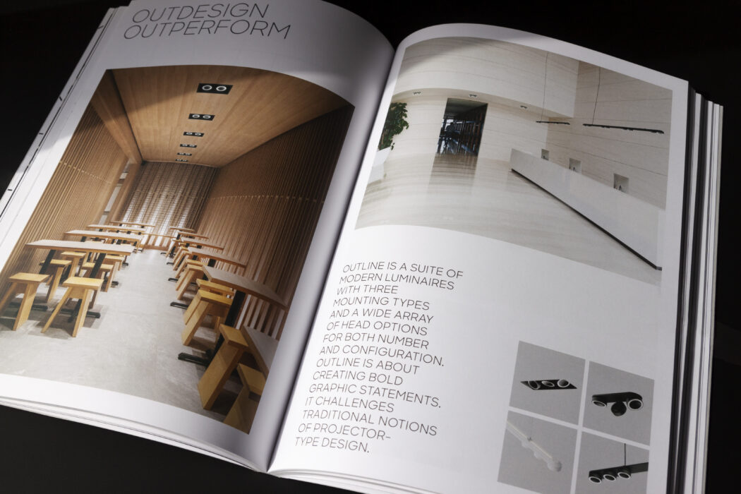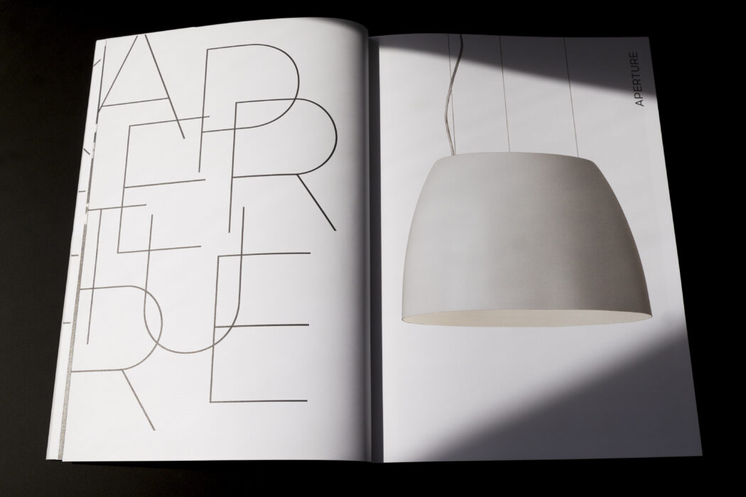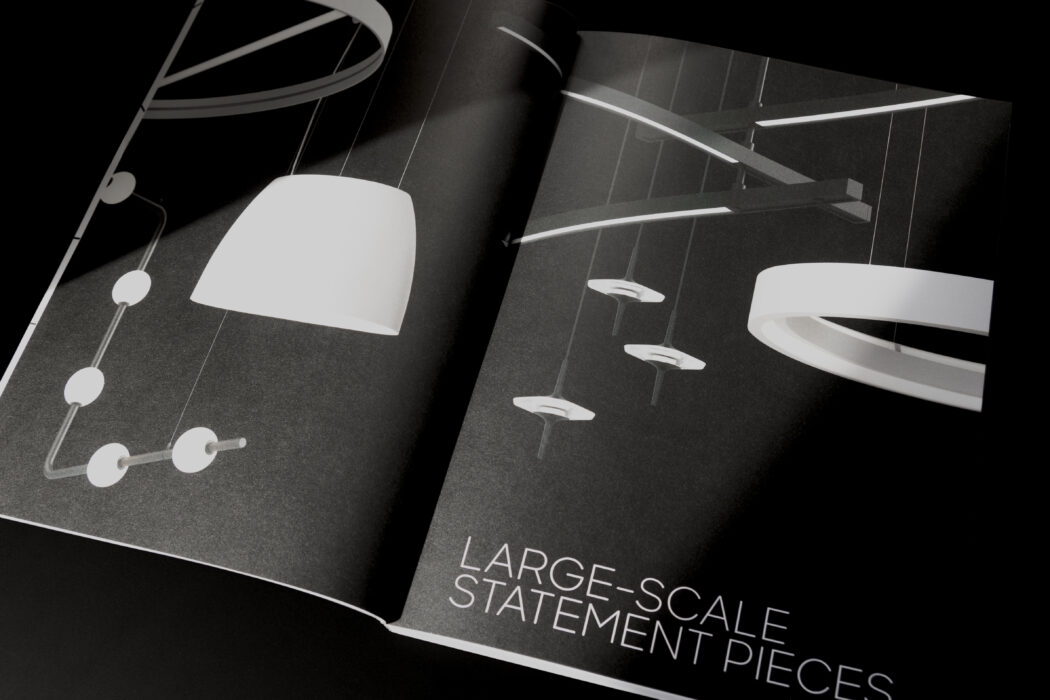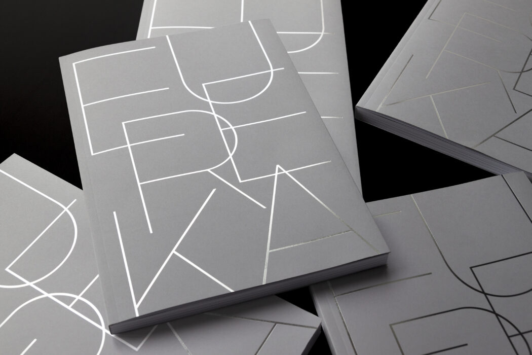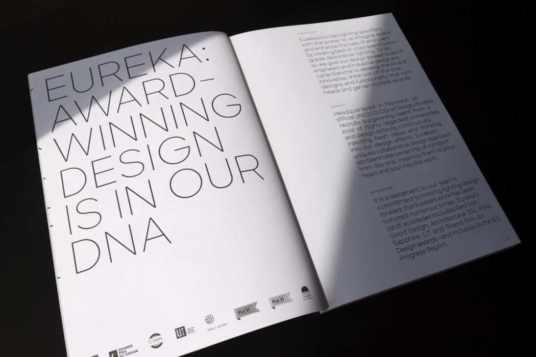 Agrémentant l’espace architectural grâce à des solutions d’éclairage attrayantes, Eureka se distingue par la création de luminaires uniques et innovants. Afin de répondre aux besoins plus spécifiques de sa clientèle d’architectes et designers d’intérieur, la compagnie crée un booklet inspirationnel offrant à voir des modèles sélectionnés à la direction visuelle distinctive ainsi que des espaces commissariés. Une pièce devenant pour cette distinguée clientèle une référence en matière de tendance et de nouveautés. Une attention particulière est accordée à ce raffinement typographique qui joue des contreformes et formes, un contraste évocateur de la lumière blanche. Les lettres s’entrelacent entre elles à la manière des armatures de luminaires pour créer des compositions architecturales. Le tout laisse entrevoir la volonté d’Eureka à révolutionner les espaces de vie.