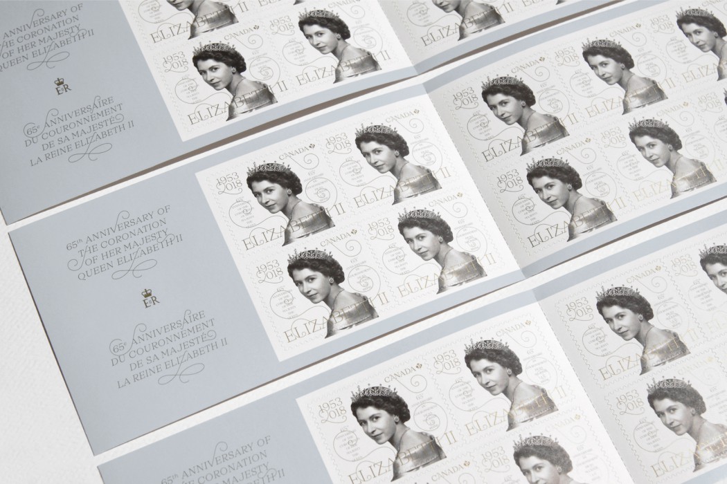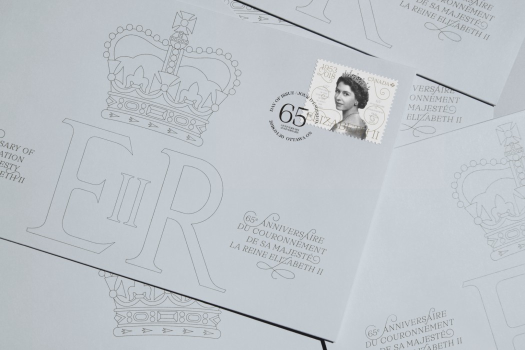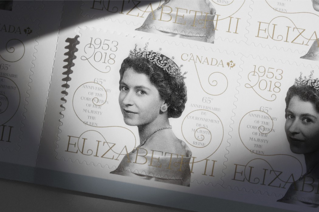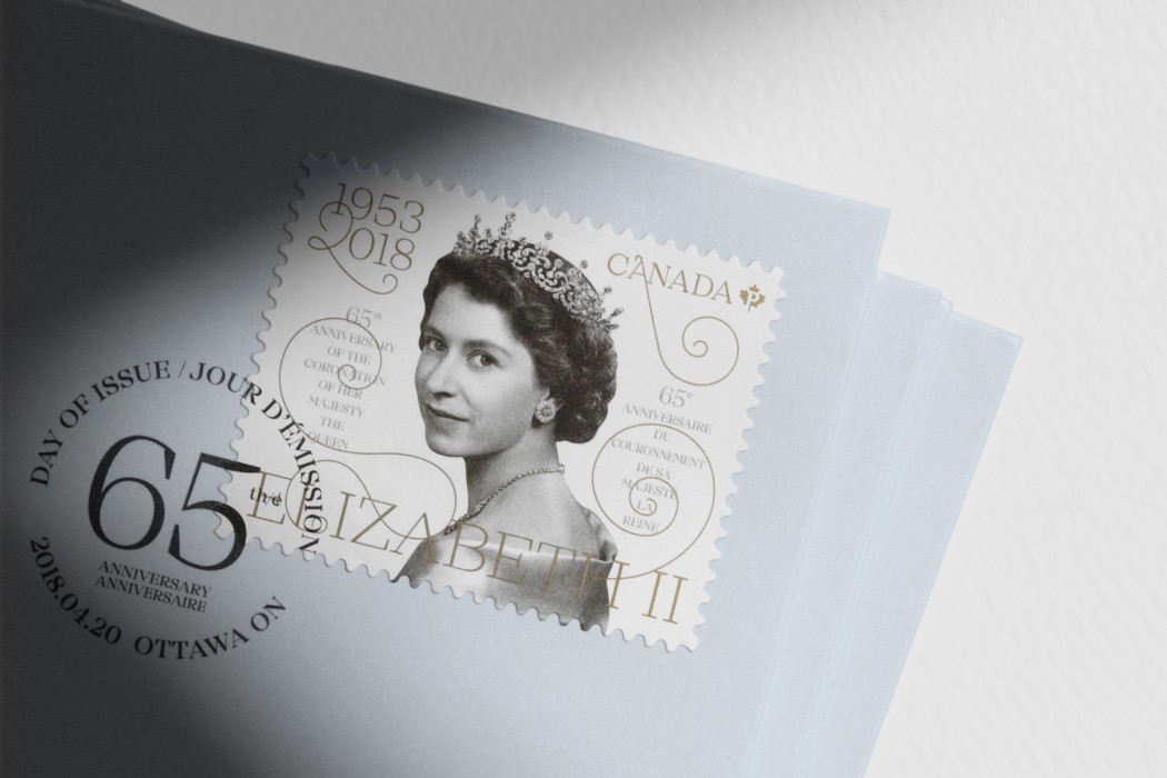 Pour le 65e anniversaire du couronnement de Sa Majesté la reine Elizabeth II, Post Canada a émis un timbre en son hommage. Le portrait qui orne ce timbre est tiré d’une célèbre séance photo réalisée par Yusuf Karsh.