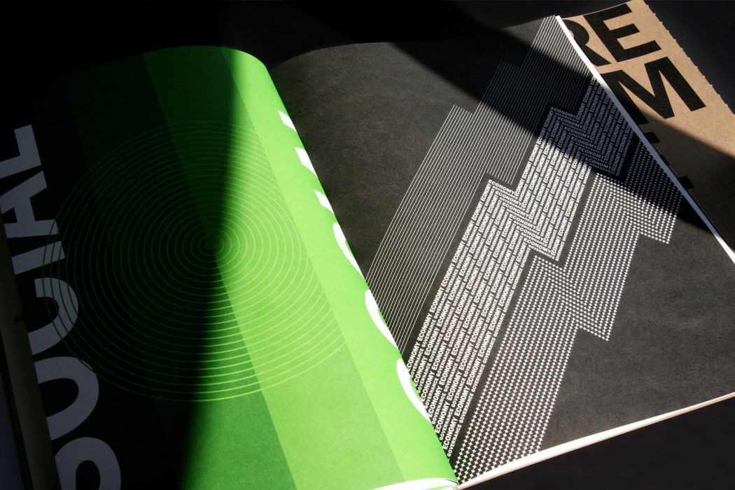 Pour l’occasion, nous avons réalisé un document entièrement fait de matériaux recyclés et imprimé en deux couleurs. Pour la couverture, nous avons eu recours au carton recyclé, recyclable et compostable de Cascades. Écologique, jolie et ingénieuse, cette couverture scellée a aussi servi d’enveloppe pour l’envoi du document.