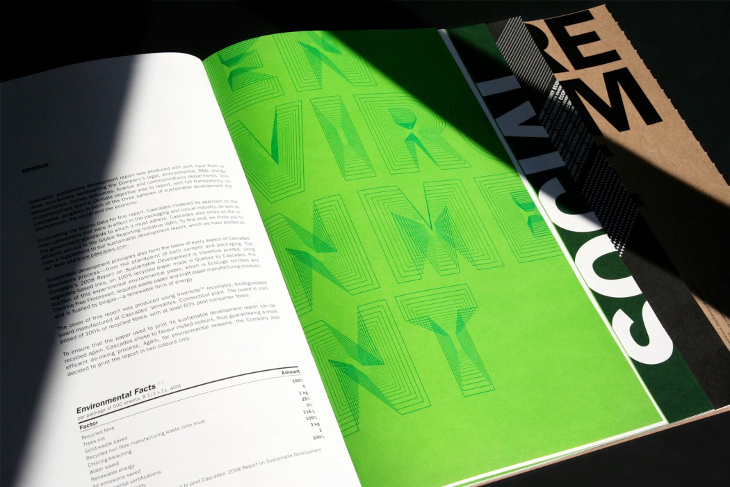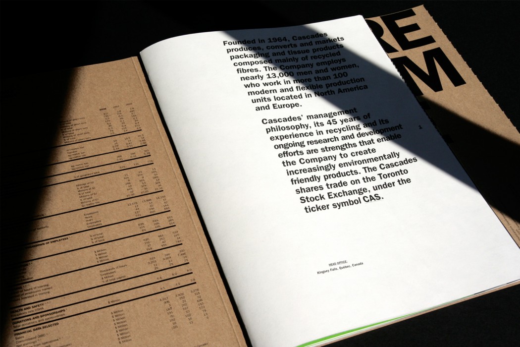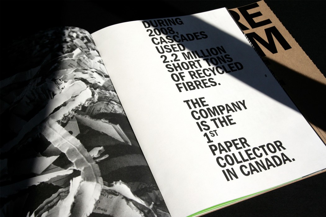 Cascades œuvre dans les domaines de la fabrication, de la transformation et de la commercialisation de produits composés de fibres recyclées. En 2008, l’entreprise a fait appel à Paprika pour concevoir un rapport de développement durable qui illustrerait, autant par la forme que par le fond, ses préoccupations environnementales.