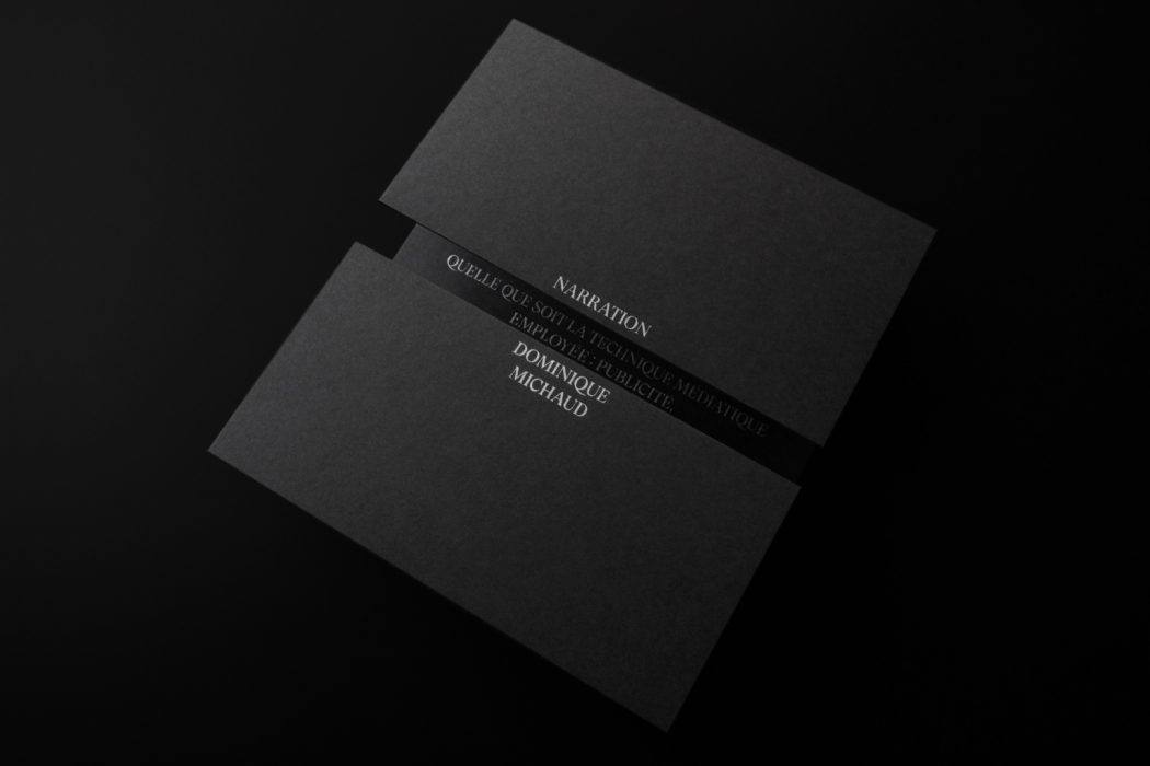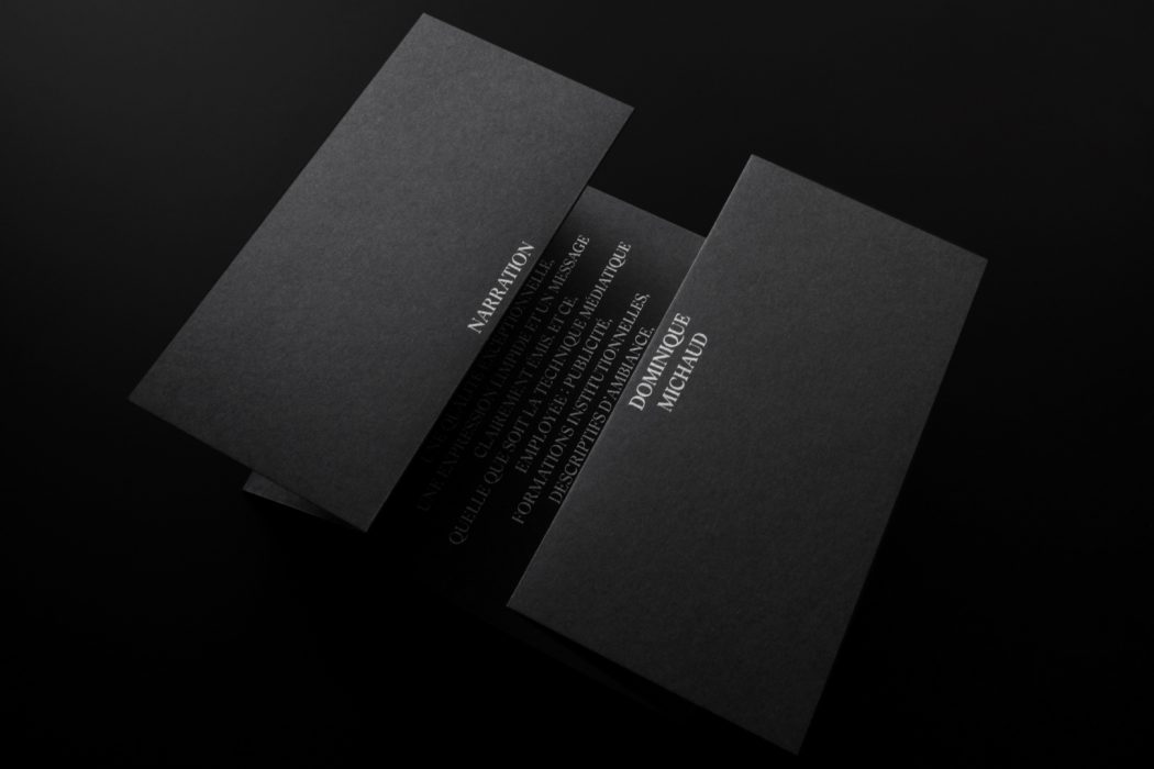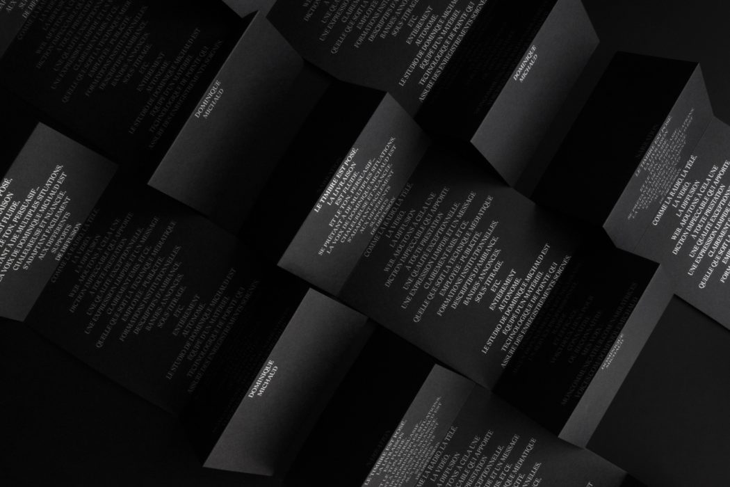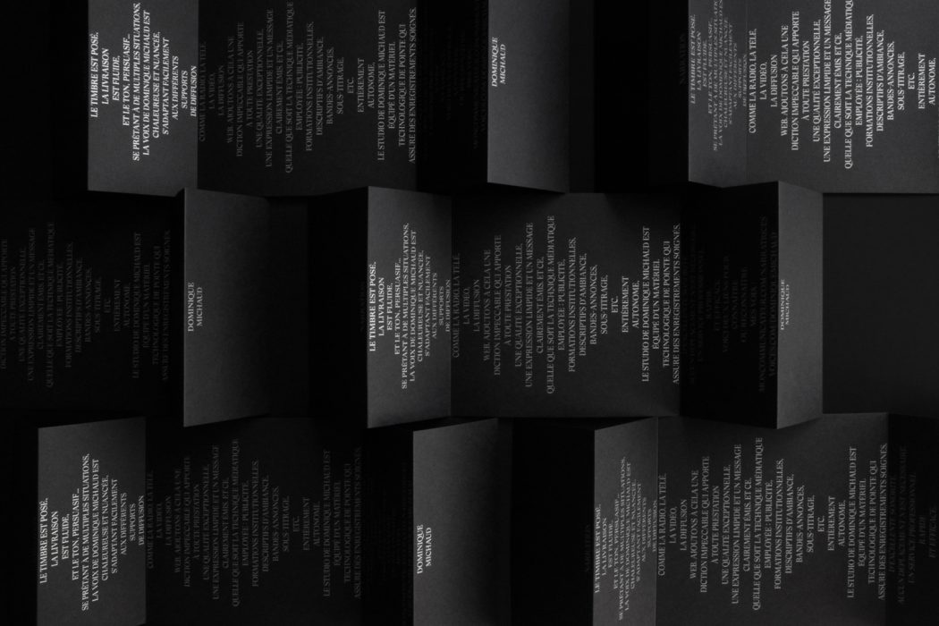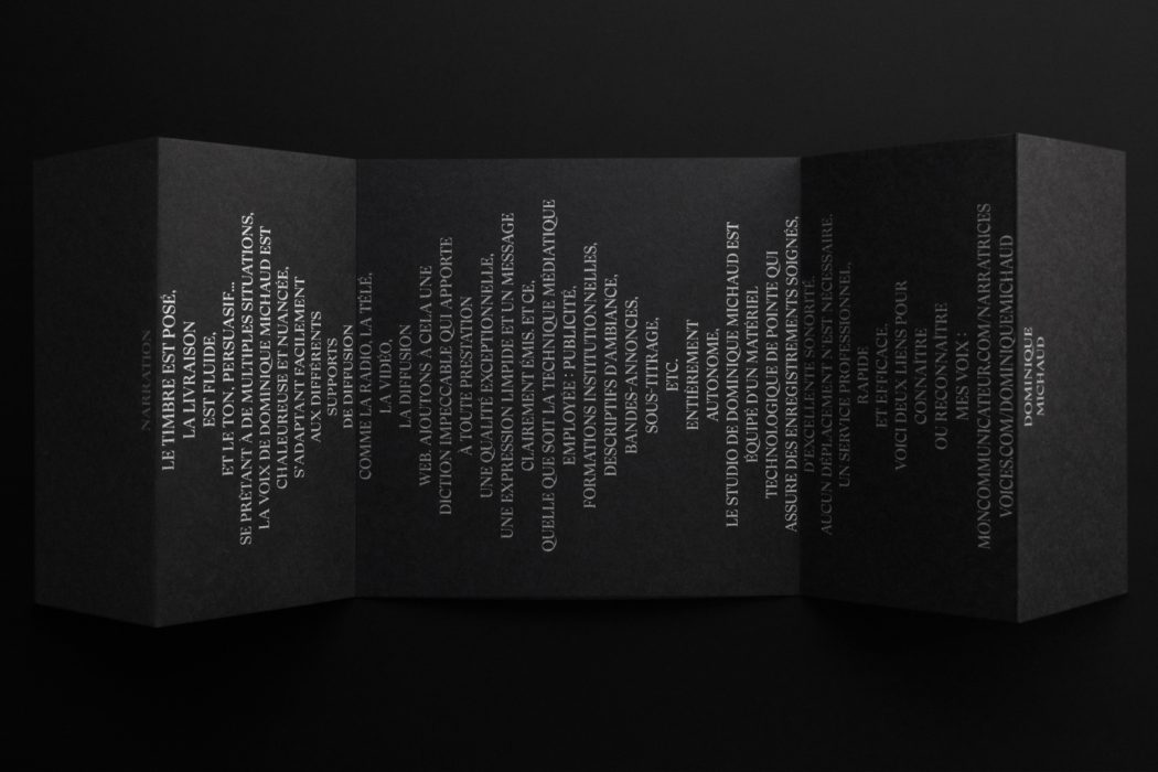 « Rien n’est beau comme la voix humaine, quand elle est belle » est la prémisse sur laquelle se base le concept de ce leave behind pour l’artiste Dominique Michaud. Mémorable par sa forme déployée avec en exergue le texte : matière première de ce talent vocaliste. À la manière d’un bijou dans un écrin, les textes d’encre métallique rajaillissent sur le canevas noir pour donner une signature précieuse et de haut de gamme, comme la voix de Dominique Michaud.
