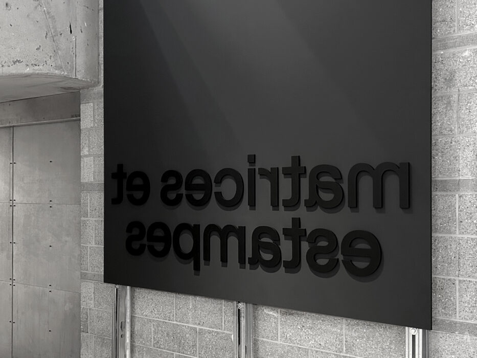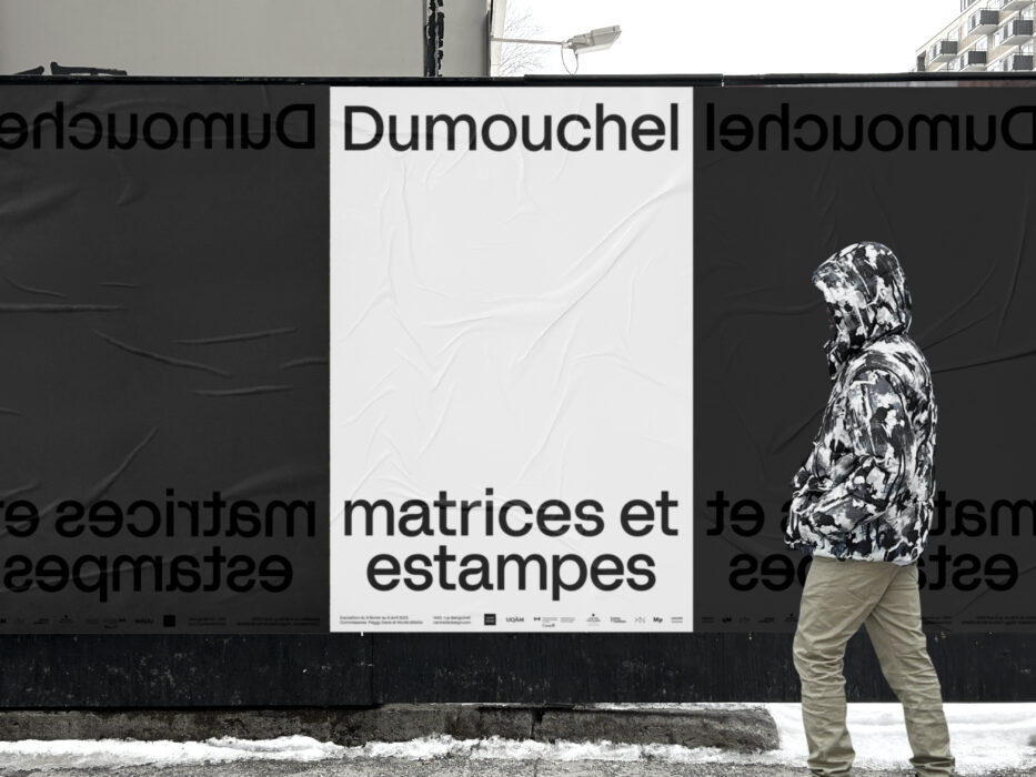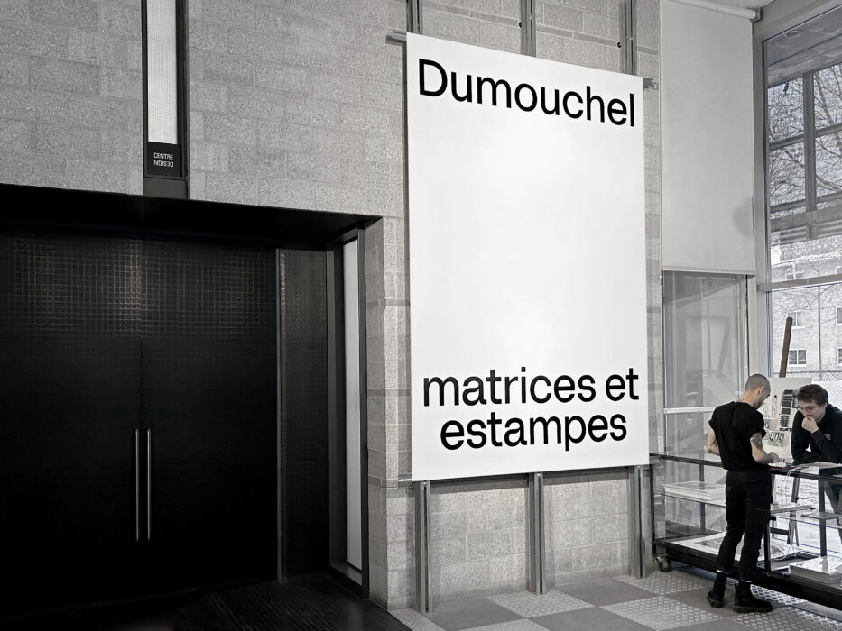 Dumouchel : matrices et estampes, cette exposition consacrée au rôle clé que jouent les matrices dans la démarche d’Albert Dumouchel (1916-1971) prend place au Centre de design de l’UQAM ce printemps, grâce au travail des commissaires Peggy Davis et Nicole Milette. La présentation d’une cinquantaine de matrices accompagnées d’estampes illustre conséquemment la démarche de cet artiste expérimentateur pour qui la création était un perpétuel processus de recherche. Pour cette exposition est créé un programme de campagne et de signalétique ancré dans la technique de l’estampe. Tenant en point d’orgue la matrice et sa résultante, la campagne se déploie un jeu typographique abouti en affiches, mur titre et bannières géantes, le tout montés sur canevas blanc ou noir pour une altérité et un impact probants.