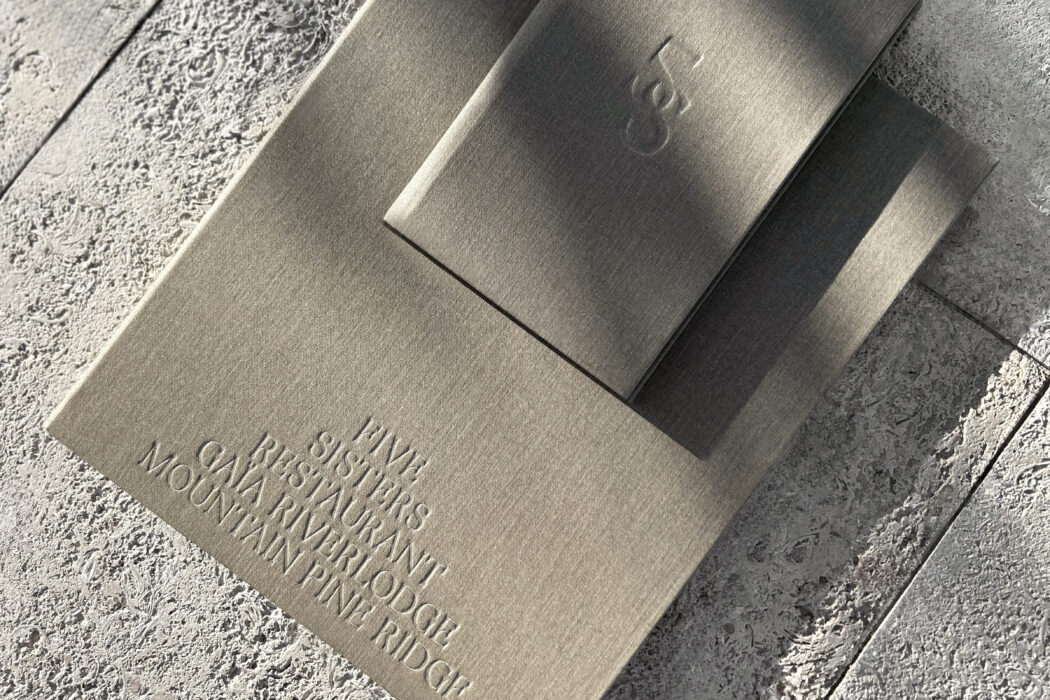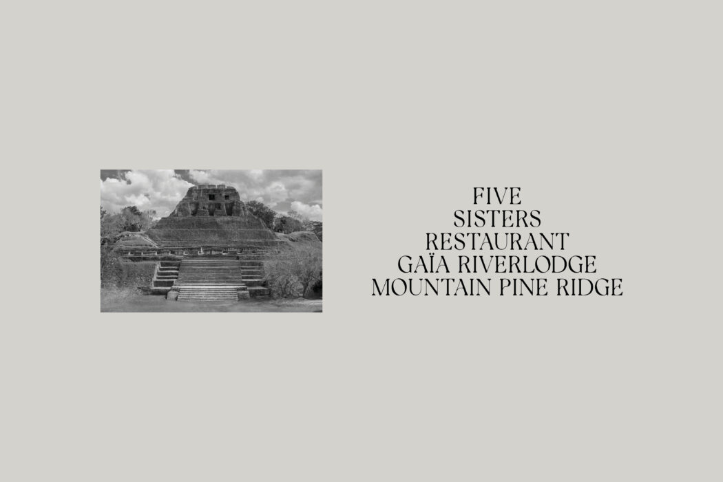Le restaurant Five Sisters du GAÏA River Lodge au Belize propose une expérience gastronomique en plein air. Harmonisé à l’arborescence de marque développée pour l’ensemble du complexe hôtelier, la signature Five Sisters se construit selon un principe de gradation, évocatrice des chutes éponymes situées sur le site et des temples-ruines mayas. Le système graphique propose une pleine modularité par son usage sur cinq niveaux en plus d’un monogramme : entrelacs de la lettre s et du chiffre 5.