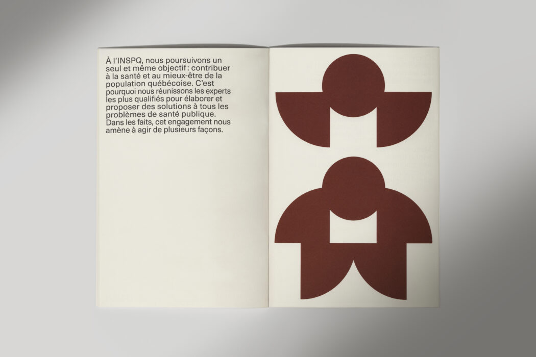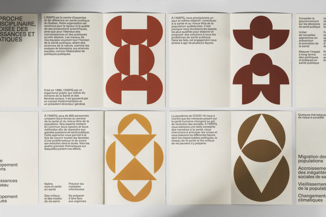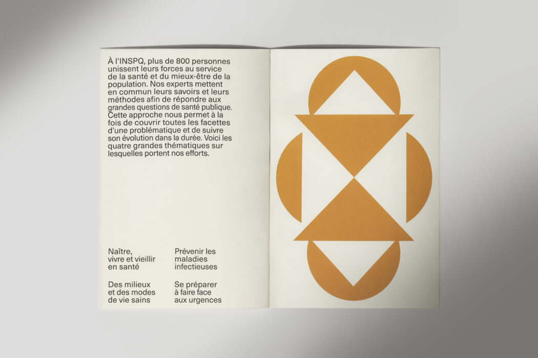 Avec ces deux brochures imprimées, l’INSPQ souhaite vulgariser son rôle au sein de la population québécoise, canadienne et internationale. Elles résument les activités professionnelles et les réalisations de l’Institut et de ses employés, qui œuvrent dans toutes les industries impactées par la santé publique. La conception graphique et les illustrations développées permettent de résumer cette vaste expertise via une palette de couleur chaleureuse et humaine.