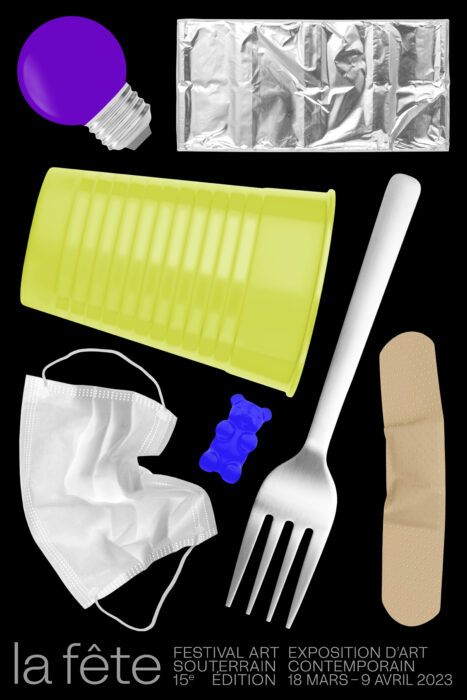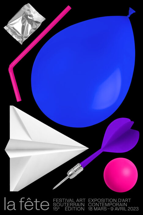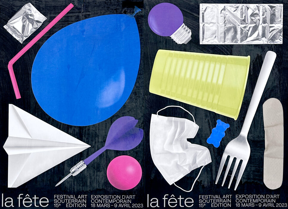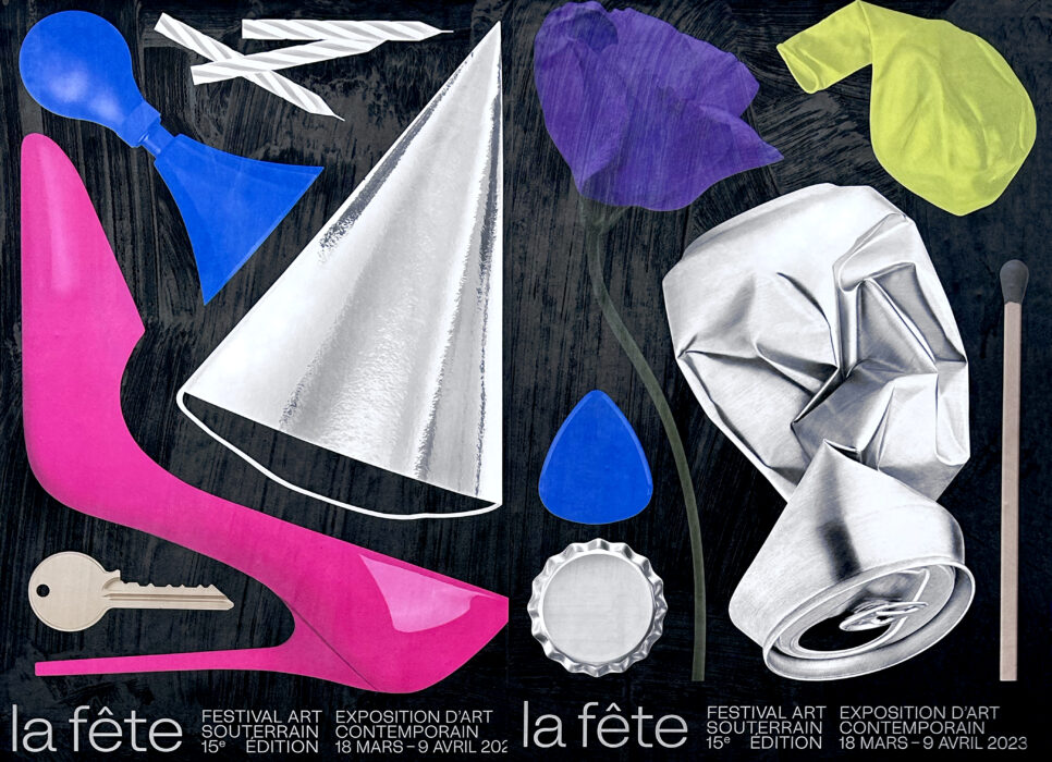 Transgresser les limites établies et célébrer l’incongruité engendre un monde autre, hétérogène et indiscipliné : la fête relève souvent d’une appropriation d’environnements divers. Qu’ils soient délaissés, sous-utilisés, indéfinis, banals, domestiques ou strictement fonctionnels – ces espaces sont propices à une dérive prospective et émancipatrice, dénuée de finalité connue. C’est sur cette prémisse que s’ancre le concept visuel de cette édition 2023 intitulée La Fête du Festival Art Souterrain à Montréal. Concourent ainsi une foule d’objets éclectiques jonchant le sol, résultante d’une fête dans sa manifestation multiple qui exprime tour à tour l’interdit, l’excès, la mise à l’épreuve du corps et l’espace-temps. Objets du quotidien et accessoires festifs prennent une coloration d’une extrême saturation et se posent en contraste avec ceux en métal froid afin de créer un ensemble aussi équivoque que poétique.