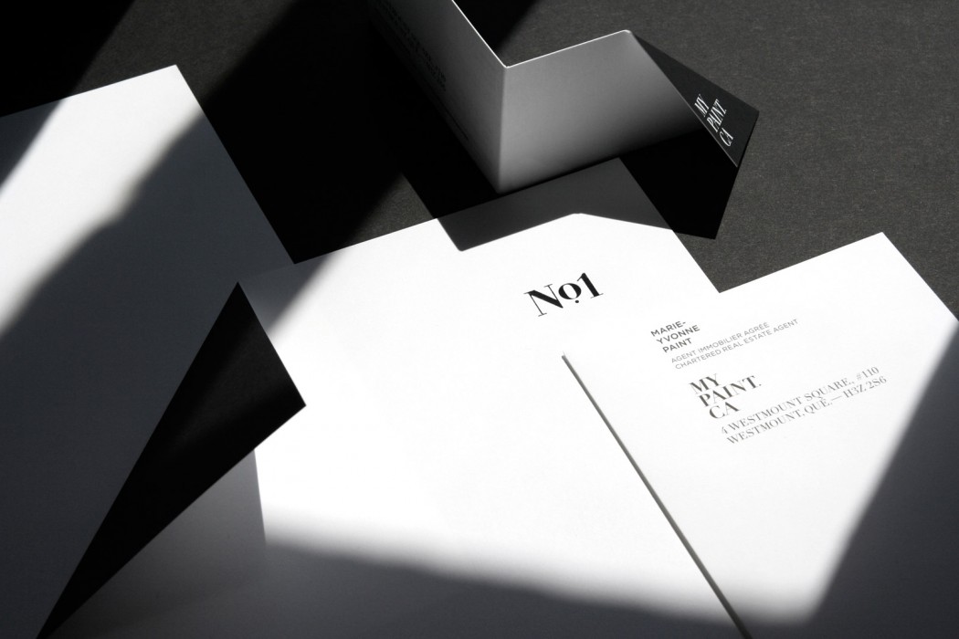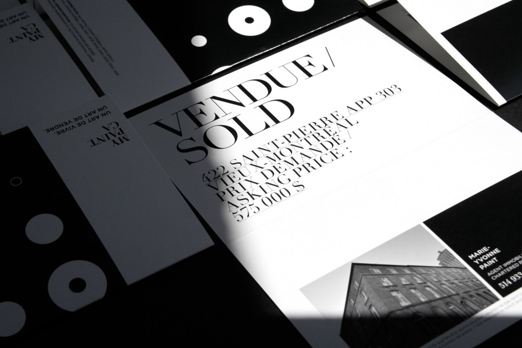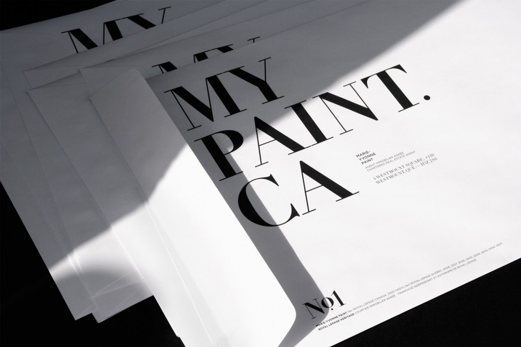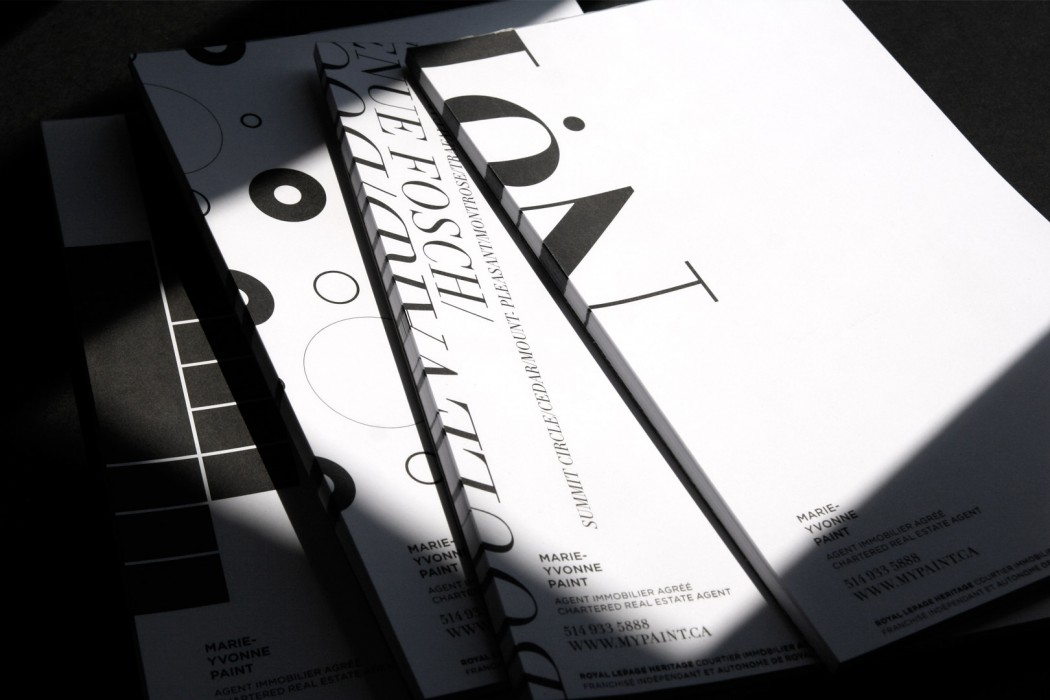 Marie-Yvonne Paint est la courtière immobilière agrée n° 1 à Montréal. Spécialisée en maisons de luxe et en condos haut de gamme, elle tenait à ce que Paprika revoit son programme d’identité afin de mieux communiquer cette sophistication et sa notoriété. Le noir et blanc et une police de caractère à empattement classique étaient tout désignés pour ce projet singulier. Le statut de chef de file de Marie-Yvotte Paint dans son domaine a, par ailleurs, constitué un élément clé de l’identité visuelle. Des formes géométriques simples imprègnent divers imprimés tels la papeterie, le dossier de presse, les blocs-notes ainsi qu’un éventail de dépliants publicitaires.