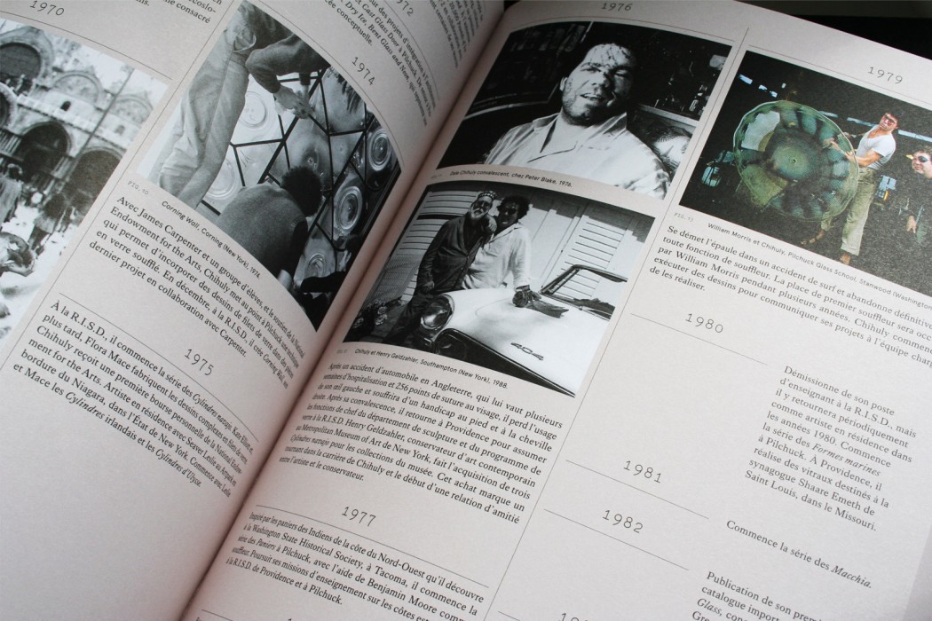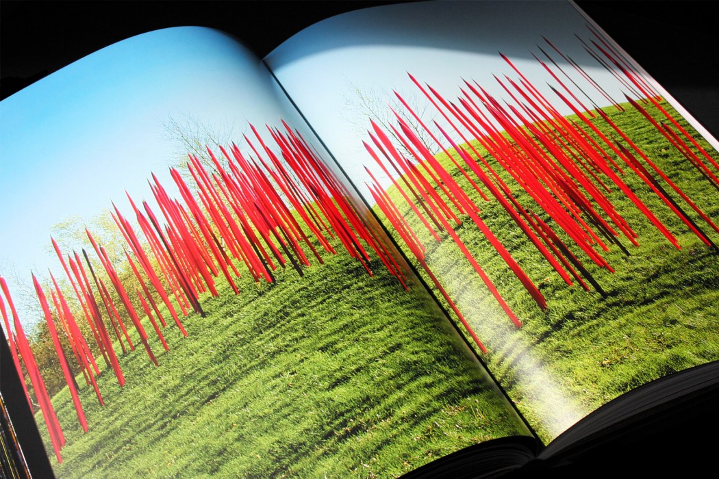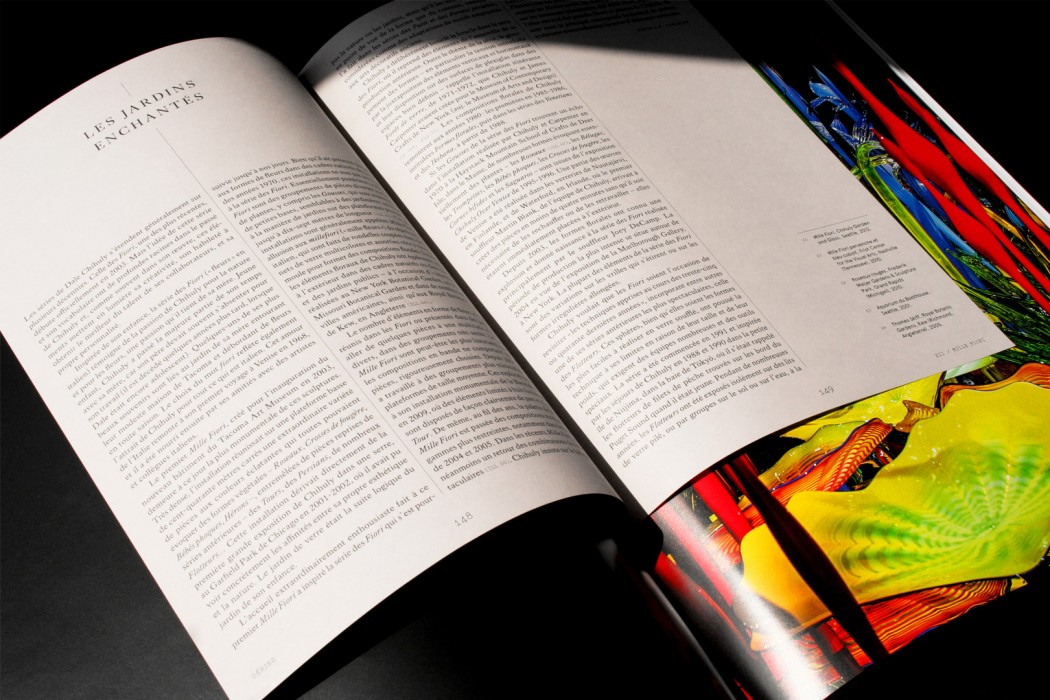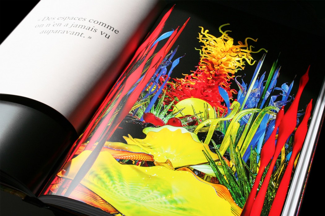À l’occasion de l’exposition consacrée à l’artiste verrier Dale Chihuly, le Musée des beaux-arts de Montréal a mandaté Paprika pour la réalisation du premier livre en français dédié à cet artiste. Inspirés par ses œuvres au format démesuré, nous n’avons pu nous empêcher de réaliser un livre grand format qui allait communiquer toute leur grandeur. Également charmés par sa palette de couleurs vives, nous l’avons reprise pour les pages de garde. Une harmonie naturelle s’est établie entre le portfolio et les textes informatifs grâce à l’emploi de papier glacé pour l’un et de papier mat pour les autres. Décrivant le contexte de travail des œuvres à apparaître dans les prochaines pages, des cahiers d’insertion de petit format ont également tenu lieu de séparateurs de section. Il va sans dire qu’un travail typographique sans failles s’est imposé pour ce projet d’édition d’envergure.