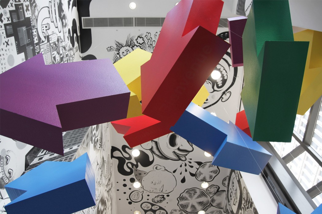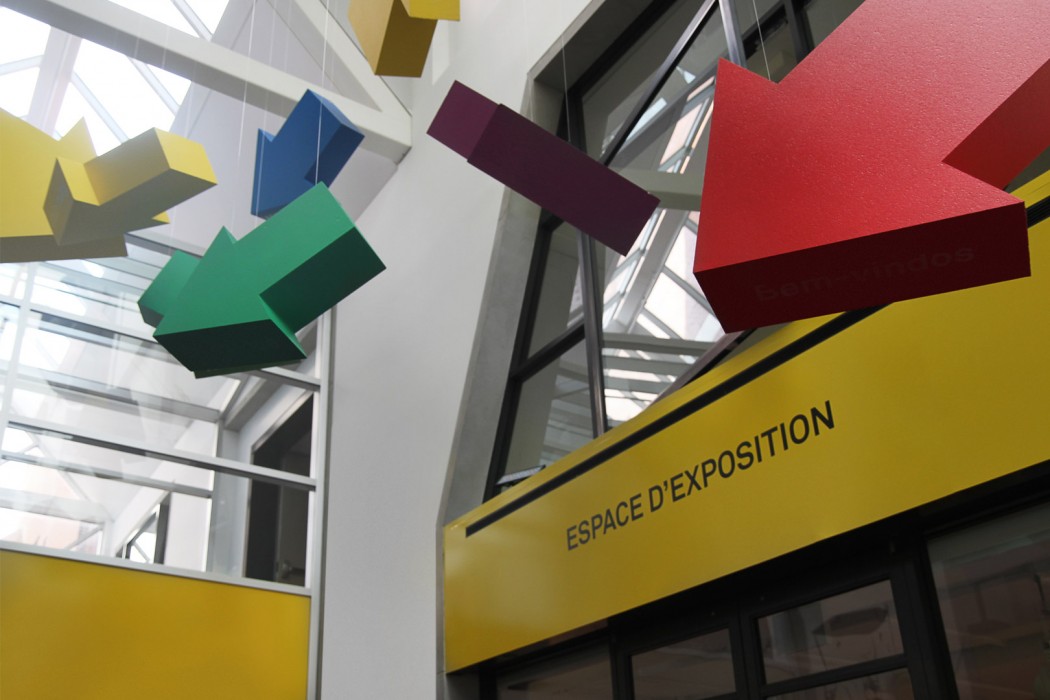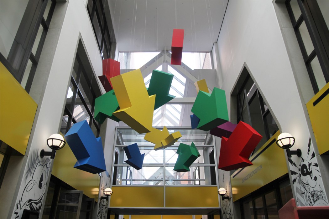 «L’art est partout», voici le message du Musée lorsqu’on entre dans ces espaces éducatifs. Pour concrétiser ce message, nous nous sommes servi d’imposantes flèches 3D de couleurs vives que nous avons suspendues au plafond. Ainsi, la Promenade, porte d’entrée des groupes vers les studios, devient un carrefour fléché incitant les visiteurs à embrasser l’art et à prendre conscience qu’il se trouve là où ils n’y pensaient peut-être pas au premier abord.