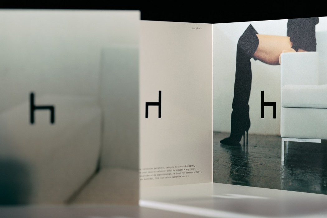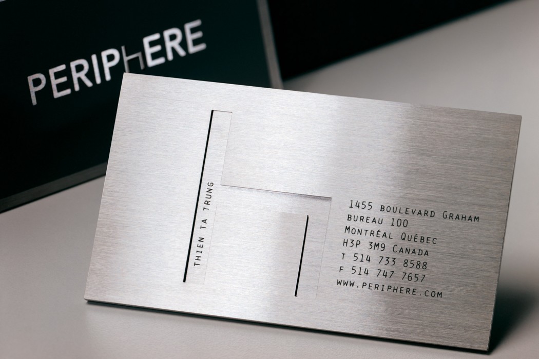 Pour répondre à ce mandat, nous avons dessiné une signature simple mais percutante, où le «h» imite le profil d’une chaise. Sans mauvais jeu de mots, ce détail assied le logo et lui confère une aura de stabilité. La carte professionnelle se devait, par conséquent, d’être à la hauteur de cette promesse. Nous avons donc produit des cartes faites de métal afin de démontrer que Periphere ne lésinait pas sur la qualité, et ce, même dans les détails les plus anodins. En partie grâce à son image de marque osée, son entrée dans le domaine fut remarquée.