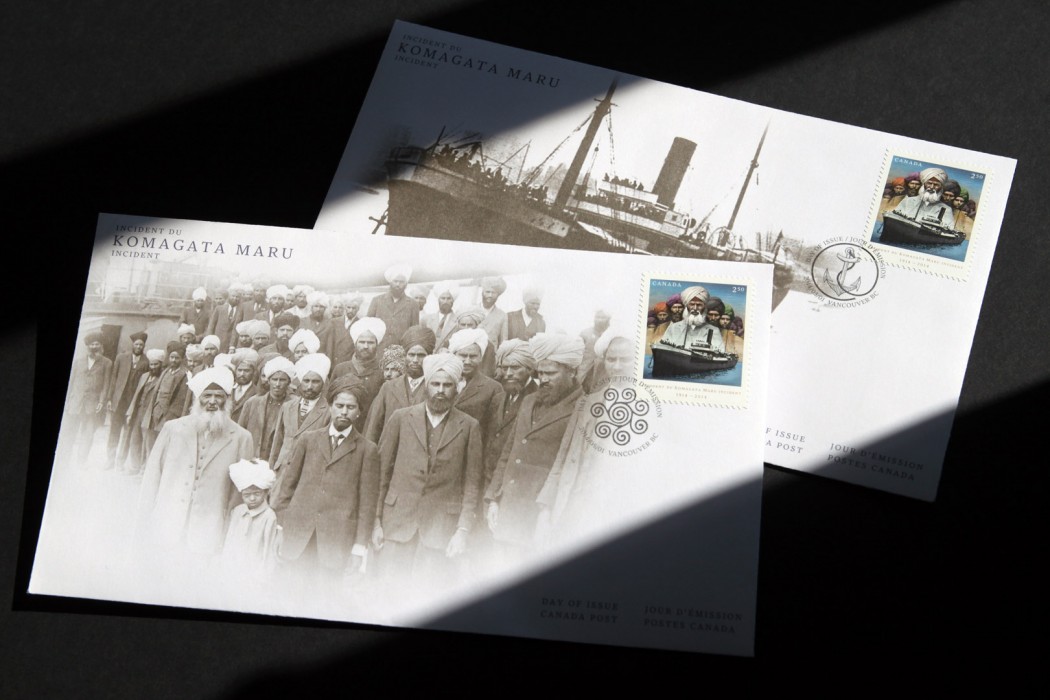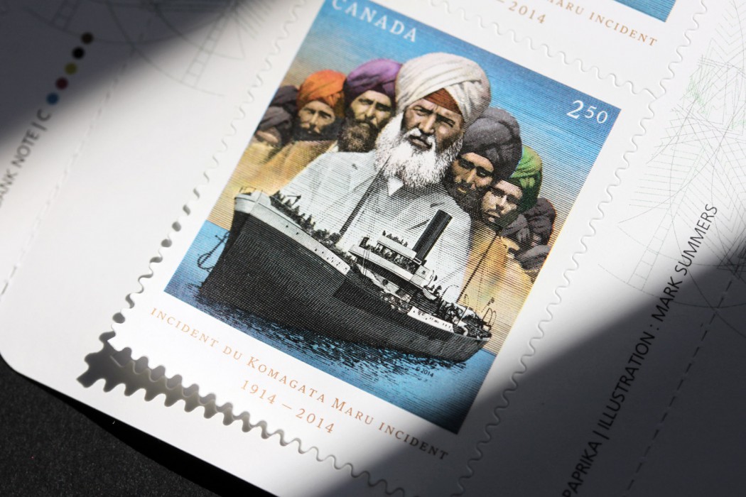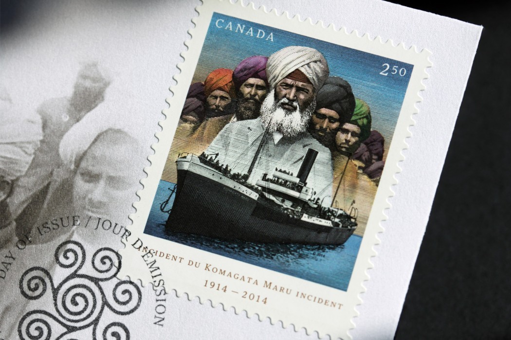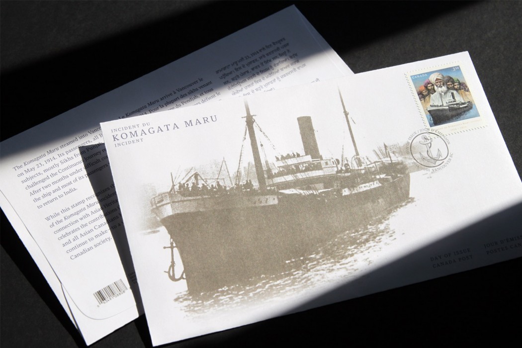 Le 23 mai 1914, le navire japonais Komagata Maru arrive dans la baie Burrard à Vancouver avec à son bord 376 passagers, pour la plupart des sikhs originaires du Pendjab en Inde. Aux termes d’une politique d’exclusion adoptée par le gouvernement canadien, il leur est interdit d’entrer au Canada et le navire se voit dans l’obligation de rebrousser chemin. À l’occasion du Mois du patrimoine asiatique, Postes Canada a émis un timbre pour souligner cet événement et démontrer le progrès accompli depuis pour bâtir une société plus tolérante et diversifiée. Pour commémorer cet incident, nous avons opté pour une grille sobre et classique. Dignes et solidaires, les êtres humains au cœur de ce malheureux évènement dominent l’image et évoquent la proue d’un bateau. Reproduite à l’aide de photos d’archives, l’illustration réalisée en collaboration avec Mark Summers transmet bien le caractère historique de l’évènement en respectant les détails vestimentaires des passagers et ceux du bateau arrivé sur le continent.