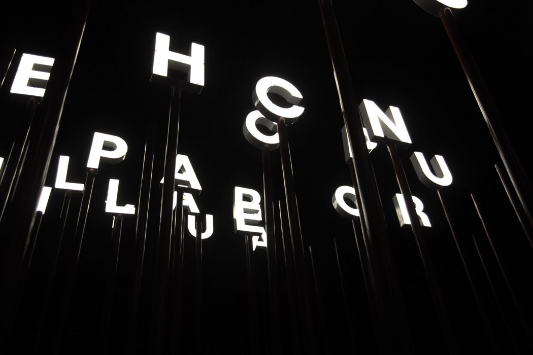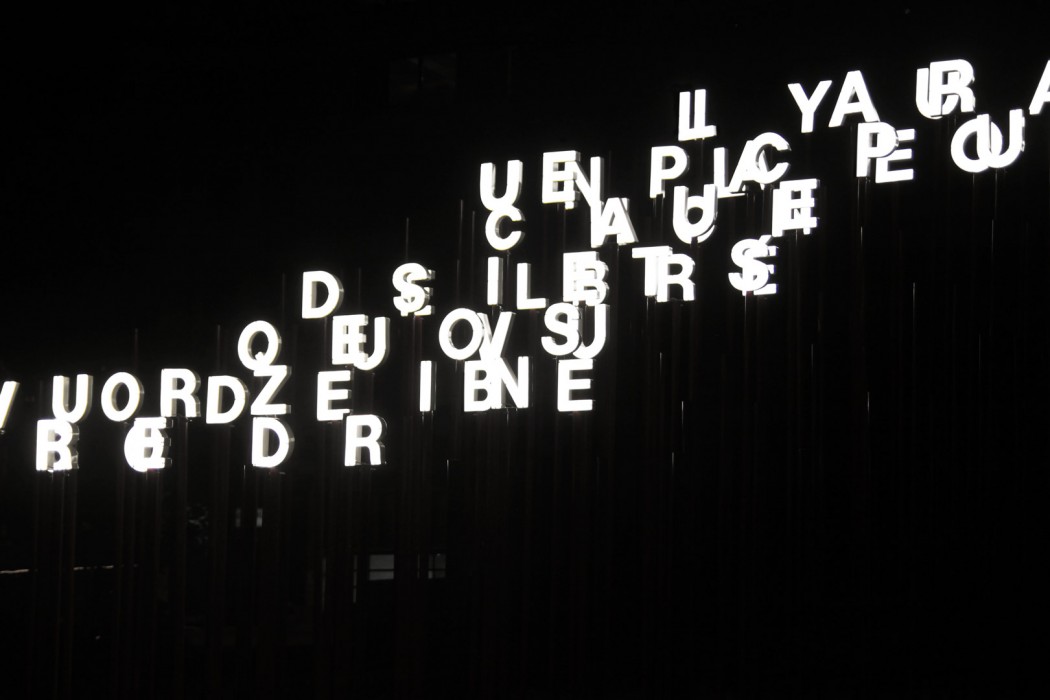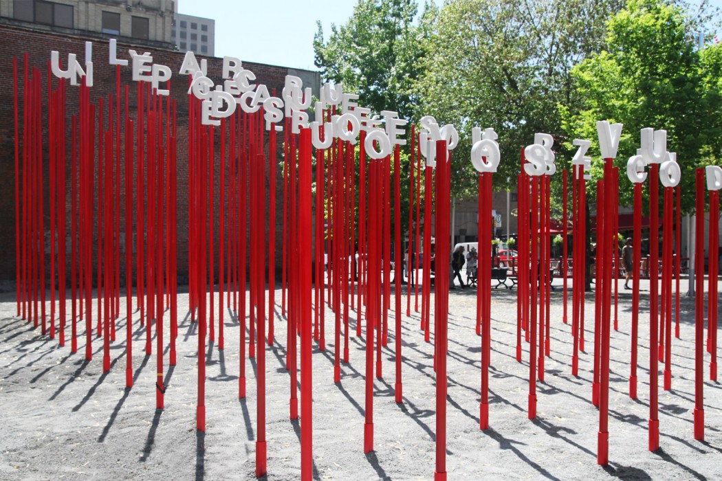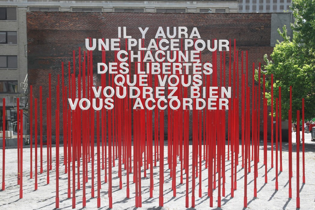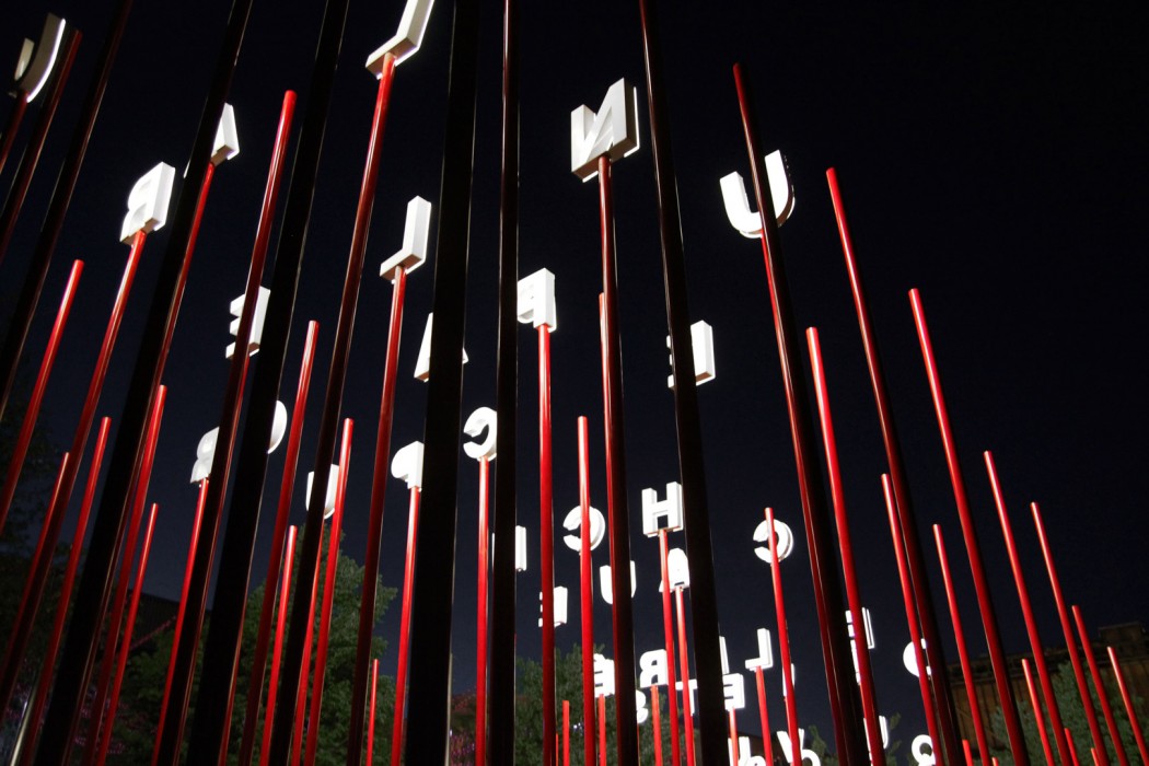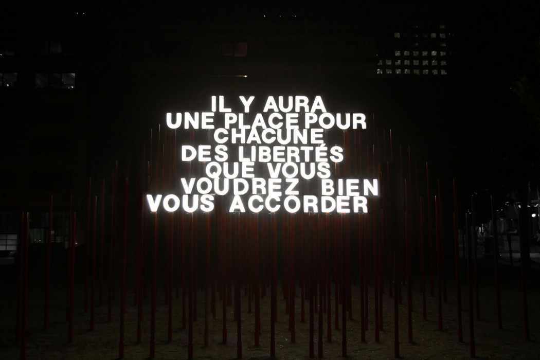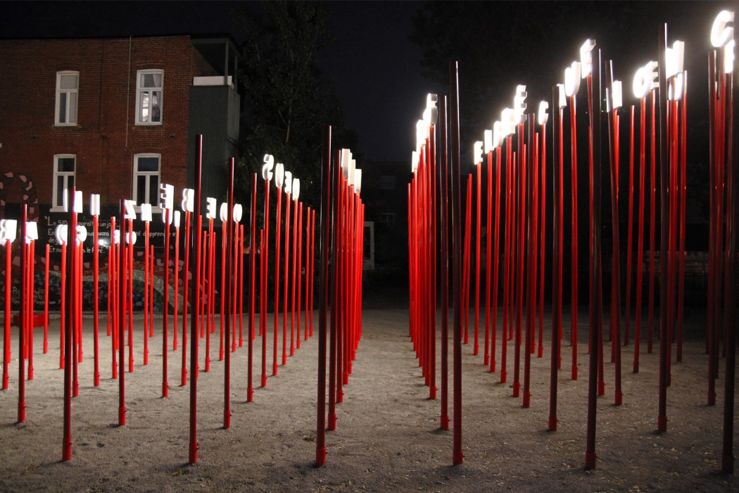Pour l’édition 2011, Paprika a été invitée à imaginer l’Aire Banque Nationale au parc Amherst. Pour habiter ce grand espace vacant, nous devions concevoir une installation d’envergure. Nous avons planté une série de tubes évocateurs des dédales des jardins anglais et couronnés de lettres lumineuses de différents formats. Au premier regard, les passants percevaient l’installation comme une simple forêt de tubes, mais depuis un endroit stratégique, ils pouvaient apercevoir des lettres lumineuses s’aligner logiquement pour former la citation «Il y aura une place pour chacune des libertés que vous voudrez bien vous accorder». Issus d’un manifeste, ces mots nous rappellent que c’est en collectivité que tout prend son sens.
