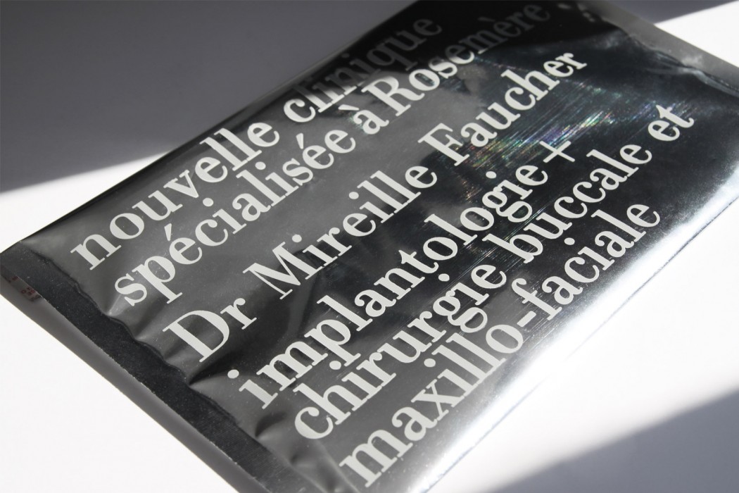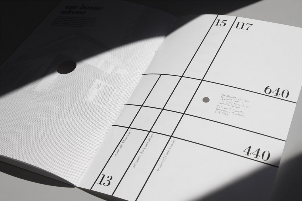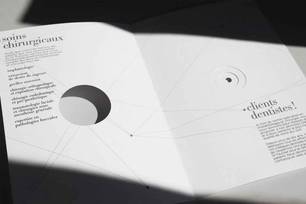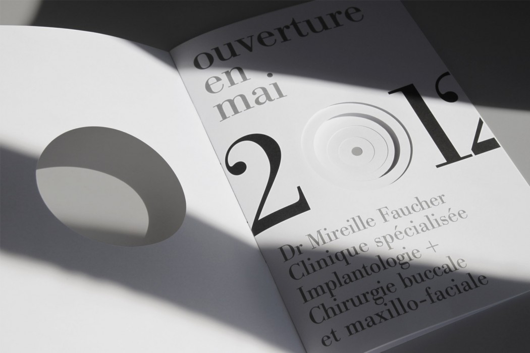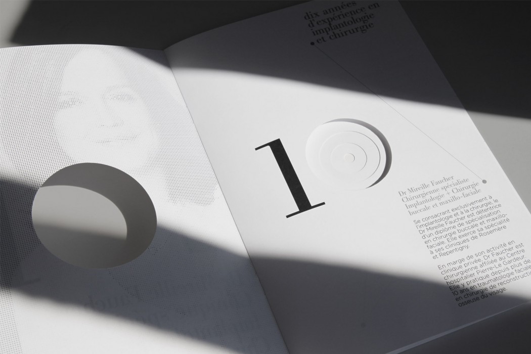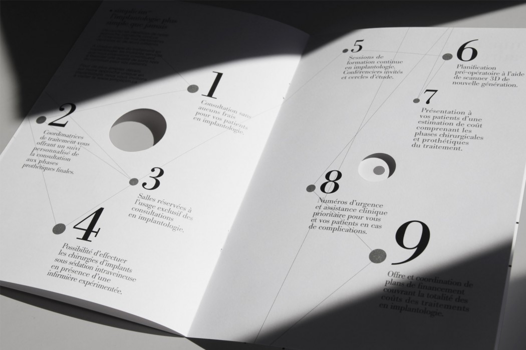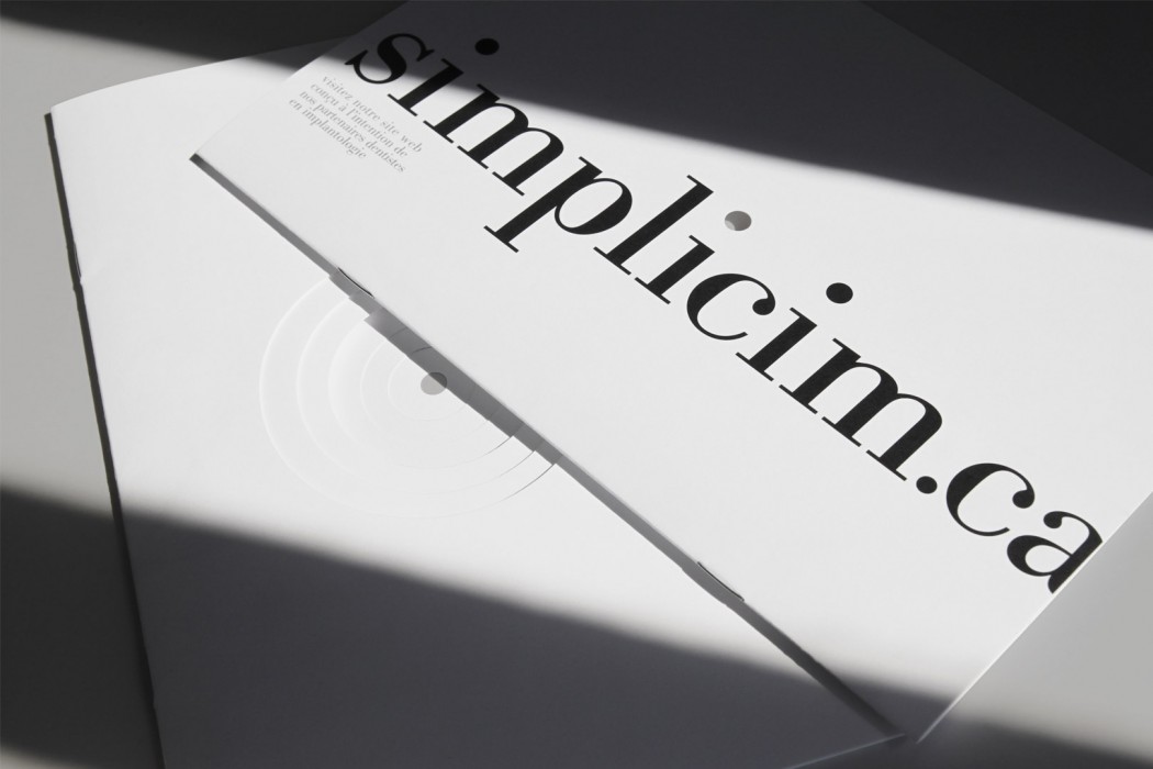 Élément important du programme d’identité visuelle de la marque – du fait, entre autres, de son évocation du pivot utilisé en implantologie –, le cercle a été joué en découpes à l’emporte-pièce concentriques. Cet astucieux emploi de découpes a permis de faire le point focal sur différents éléments informatifs au fil des pages. La sobriété visuelle, la dominance du blanc et l’enveloppe métallisée créent un lien fort avec l’image de marque de Simplicim et l’aspect novateur de sa nouvelle clinique. Une pièce qui se distingue élégamment de la masse d’envois postaux qui atterrissent sur les bureaux des docteurs!