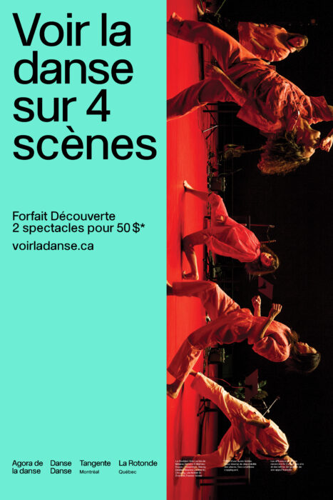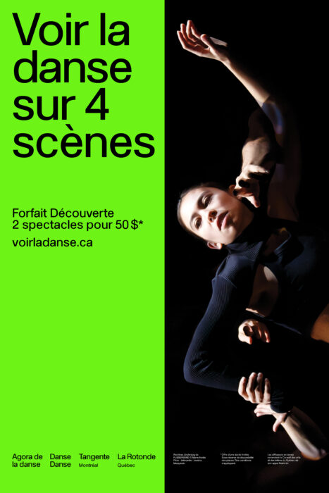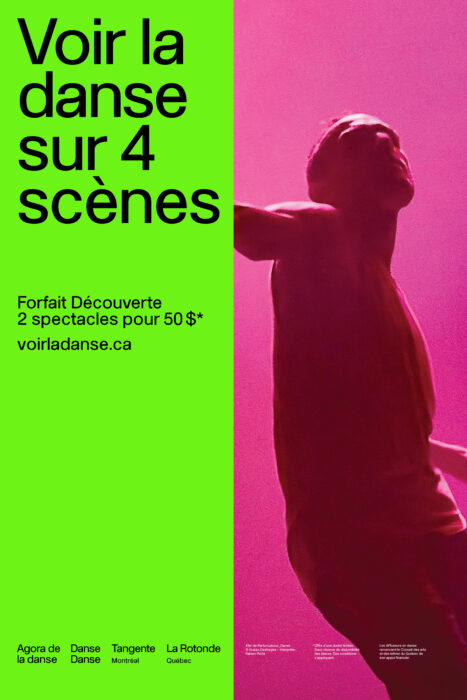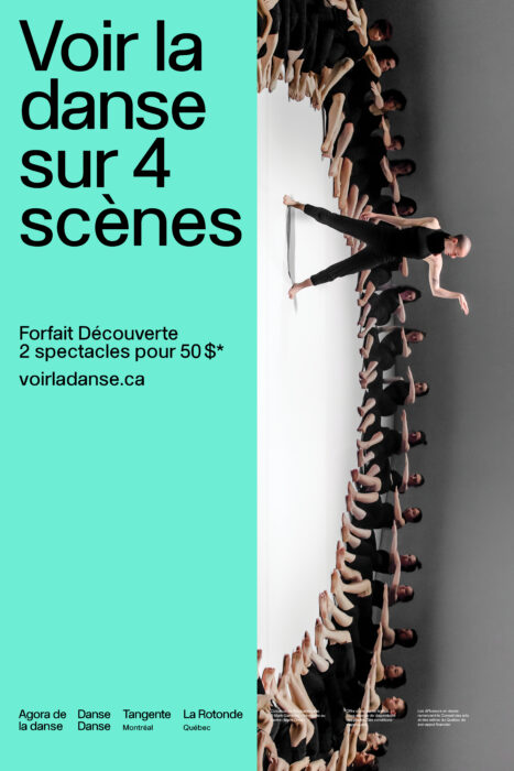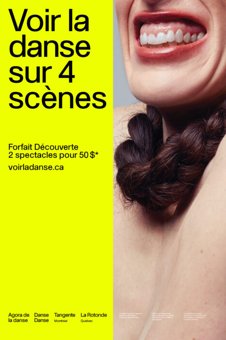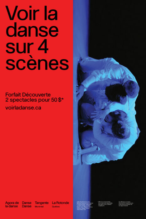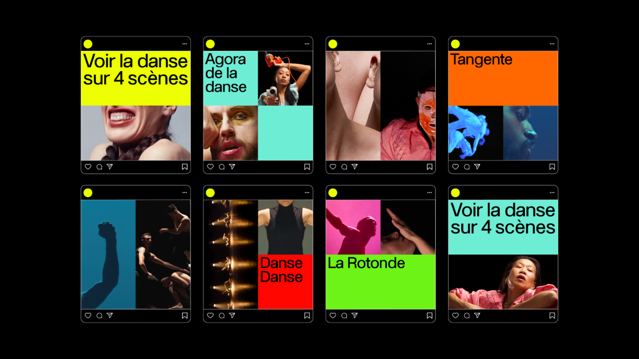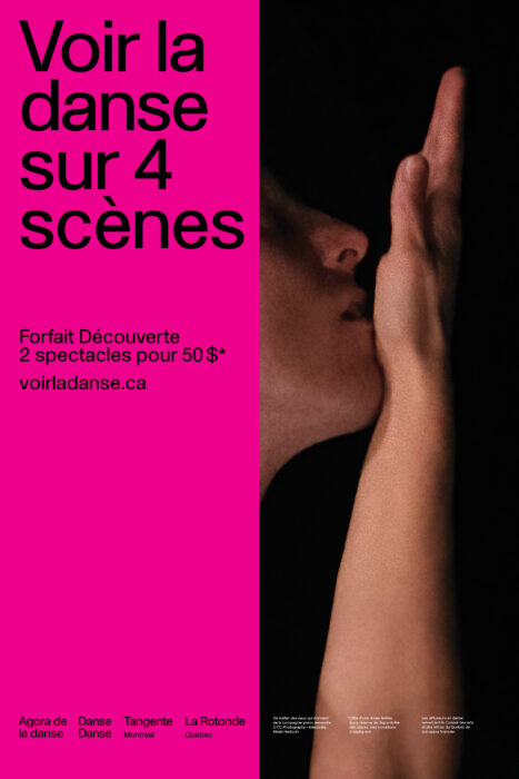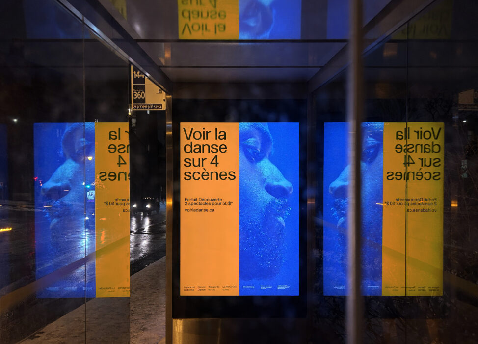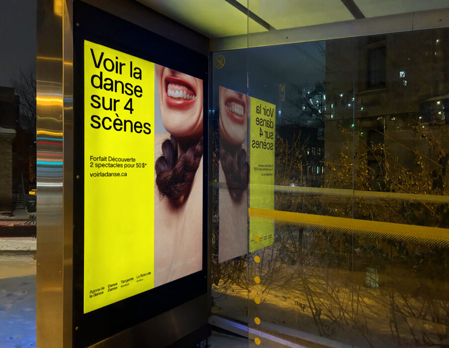 Pour une première initiative, quatre diffuseurs spécialisés en danse contemporaine, l’Agora de la danse, Danse Danse, Tangente et La Rotonde s’associent en une audacieuse campagne commune : Voir la danse sur 4 scènes. Paprika crée pour cette offensive un programme de campagne en 360, avec la danse au cœur de tout comme force de frappe inéluctable. Une palette de couleur vive et saturée, doublée d’une direction visuelle et vidéo aguerrie parachèvent cette plateforme qui se déploie sur le Web, en campagne d’affichage et à la télévision.